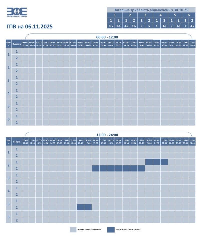 06.11.2025 на території Волинської області застосовуються графіки погодинного відключення