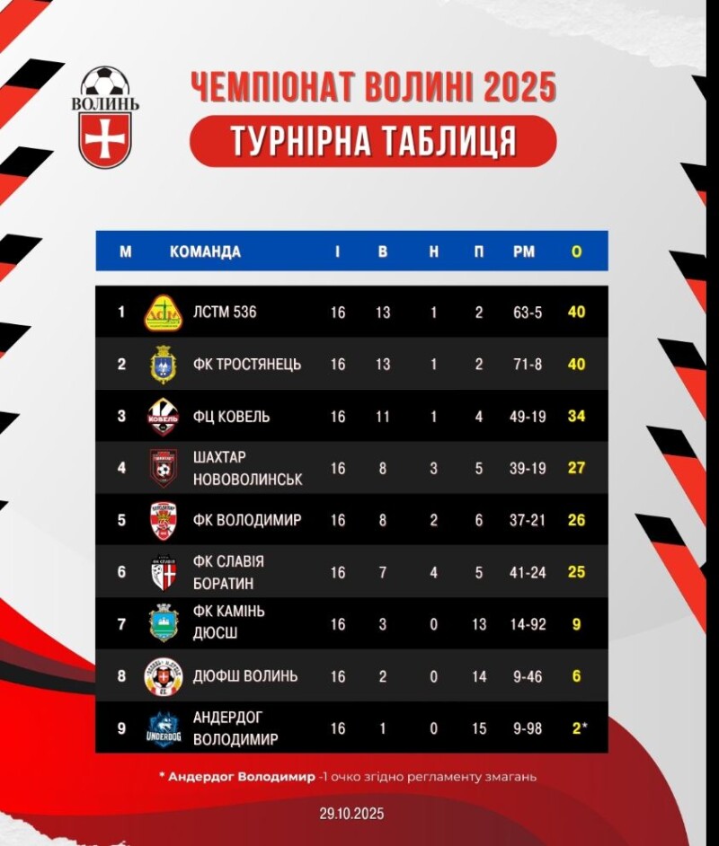 Підсумкова турнірна таблиця Чемпіонату Волині-2025: