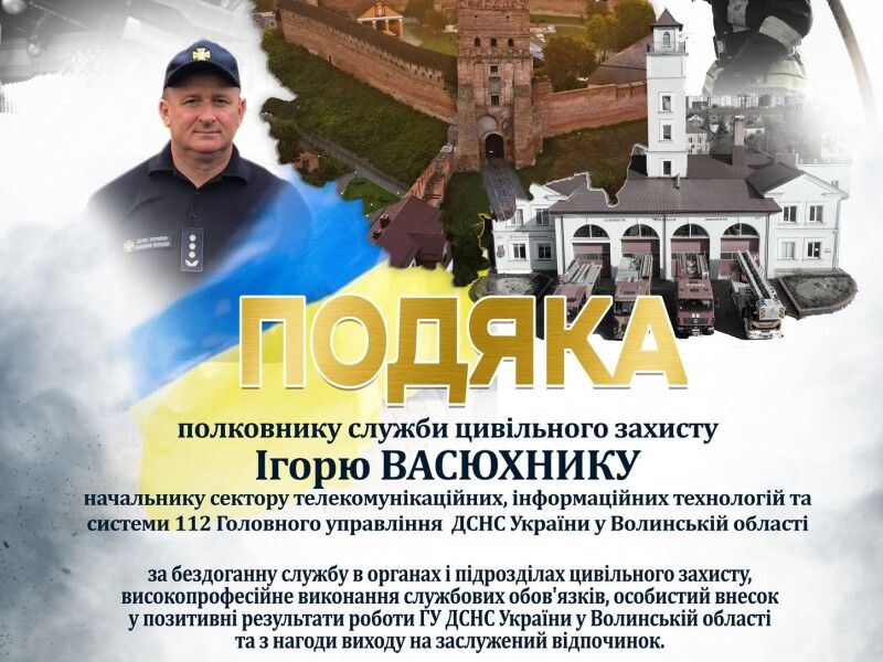 Сьогодні в Головному управлінні ДСНС України у Волинській області провели на заслужений відпочинок полковника служби цивільного захисту Ігоря Сергійовича Васюхника, начальника сектору телекомунікаційних, інформаційних технологій та системи 112, який присвятив понад три десятиліття свого життя службі в ДСНС.