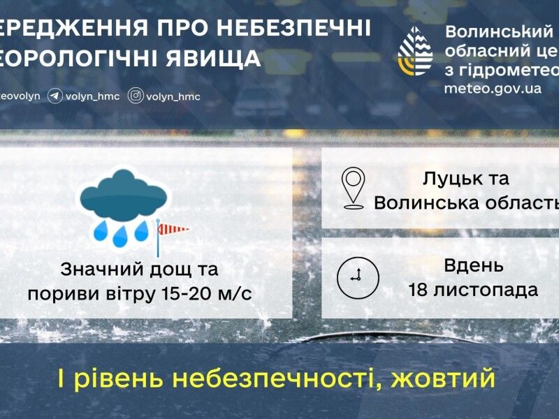 (Рівень небезпечності – І, жовтий ), інформує Волинський обласний центр з гідрометеорології.