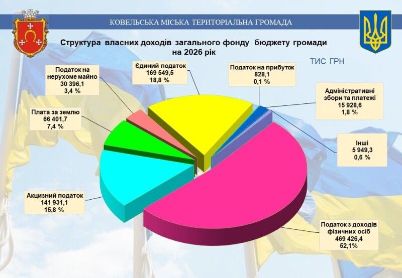 Дохідну частину сформовано в обсязі 1 млрд 191 млн грн. Власні надходження до загального фонду прогнозуються на рівні 900 млн грн, з яких понад половину становить податок та збір на доходи фізичних осіб.