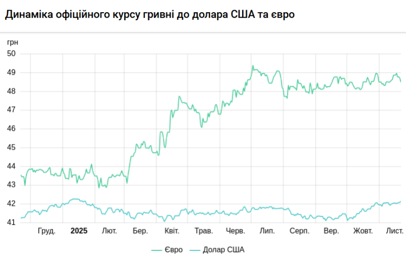 З початку року долар подорожчав на 24 копійки: 1 січня 2025 року він коштував 42,02 грн. Від початку листопада зростання американської валюти становило 29 копійок - у перший день місяця курс був на рівні 41,97 гривні за долар.