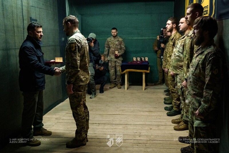 Військовослужбовці 12-ї бригади спеціального призначення «Азов», 14-ї бригади оперативного призначення «Червона Калина» та управління 1-го корпусу НГУ «Азов» отримують нагороди від президента.