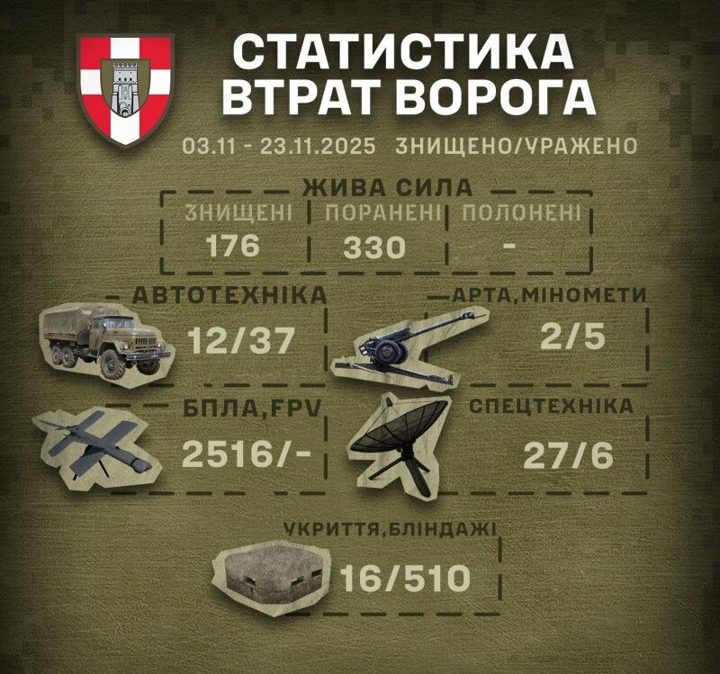 До Вашої уваги статистика втрат, завданих ворогу бійцями 100 омбр протягом трьох попередніх тижнів: 3 листопада – 23 листопада 2025 року.