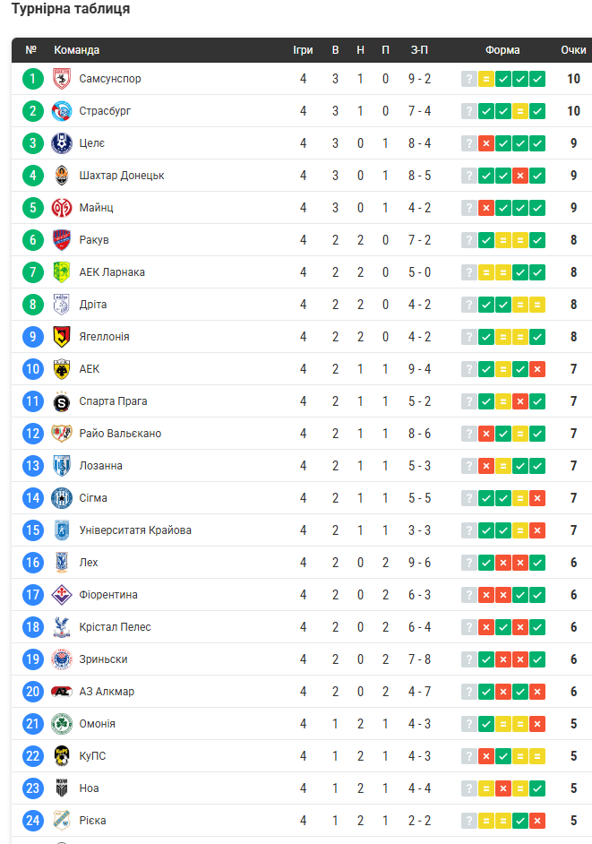 Турнірна таблиця Ліги конференцій після 4 турів: