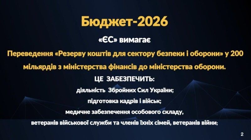 «Ми наполягаємо, щоб 200 мільярдів, які зараз зарезервовані в Міністерстві фінансів, все ж таки були розподілені на сектор безпеки і оборони за конкретними програмами. Це забезпечить діяльність Збройних Сил України, підготовку кадрів, медичне забезпечення особового складу – першочергові видатки сектору безпеки і оборони», – говорить депутатка.