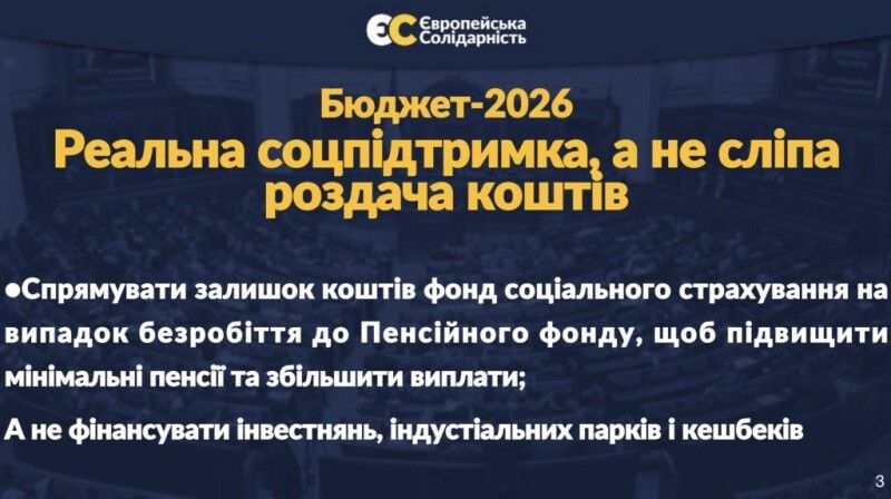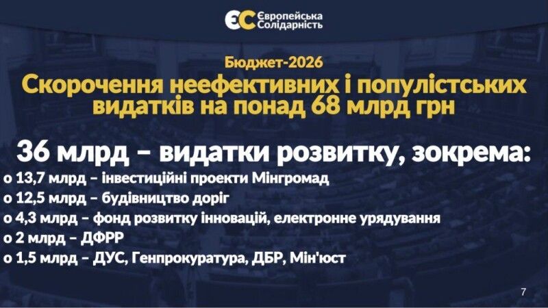 «Ми не розуміємо, як можна залишати неефективні і популістські видатки на понад 68 мільярдів гривень. Чому ми дозволяємо Генпрокуратурі, ДБР, Рахунковій, Верховній Раді, Кабінету Міністрів, Державному управлінні справами витрачати більше на своє утримання порівняно навіть з 2025 роком? Чому ми 5,5 мільярдів гривень залишаємо знову на телемарафон та стратегічні комунікації?», – обурилась Южаніна.