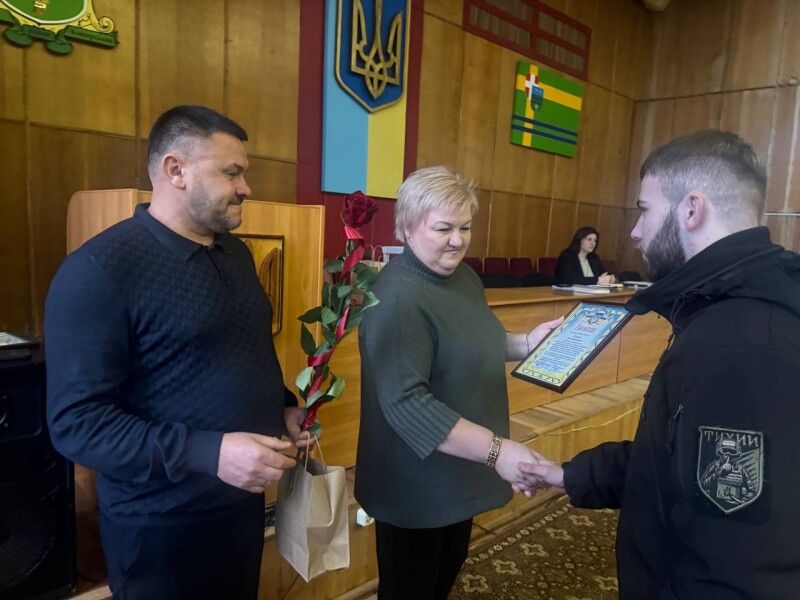 У сесійному залі перед засіданням сесії міської ради відбулося урочисте вручення грамот волонтерам міським головою Віктор Пасем та начальницею районної військової адміністрації Ольгою Ващук.