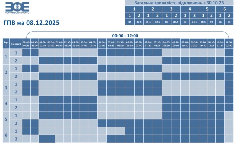 Оновлені графіки вимкнення світла на Волині 8 грудня