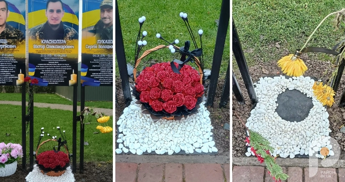Родина полеглого захисника України Віктора Краснопери встановила біля пам'ятного стенду кошик із квітами та ліхтарики, через кілька днів він зник.