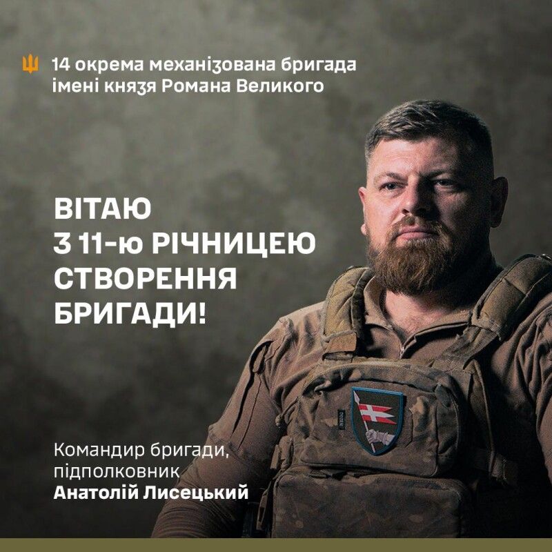 «Наша славетна 14 окрема механізована бригада імені князя Романа Великого народжена в боях на Донеччині та Луганщині за часів АТО та ООС, загартована вогнем повномасштабного вторгнення на Київщині, Житомирщині, Миколаївщині, Донеччині, Харківщині, - каже командир бригади, підполковник Анатолій Лисецький. - Князівська бригада пройшла важкі бої, вистояла під шквальним вогнем ворога, набула безцінного бойового досвіду й довела, що здатна виконувати найскладніші завдання!