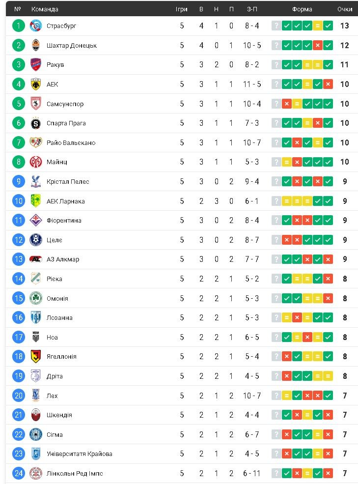 Турнірна таблиця Ліги конференцій УЄФА після 5-ти турів: