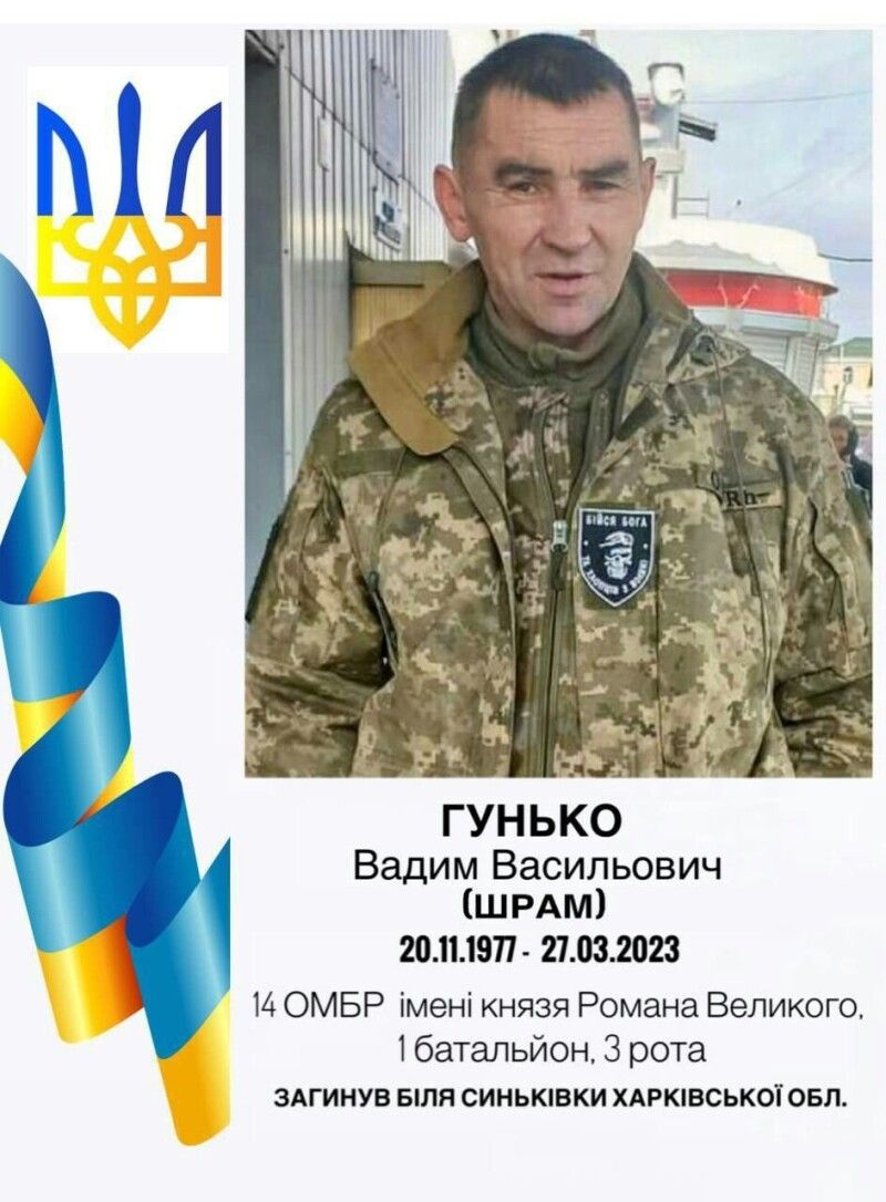Позивний Вадима Гунька на війні – «Шрам», який дістався йому через те, що мав численні травми на «гражданці» й операції, пов’язані з ними, а, отже, – й багато шрамів на тілі (до речі, праву руку, за словами дружини, чоловік міг підняти не вище рівня плеча, тож вона думала, що й на службу його не візьмуть). Майже рік він воював.