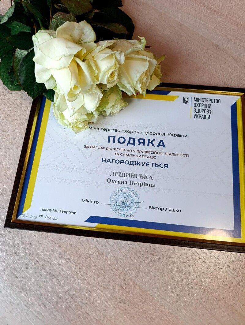 Директорку КП «Луцька міська дитяча поліклініка» Оксану Лєщинську нагороджено Подякою Міністерства охорони здоров’я України.
