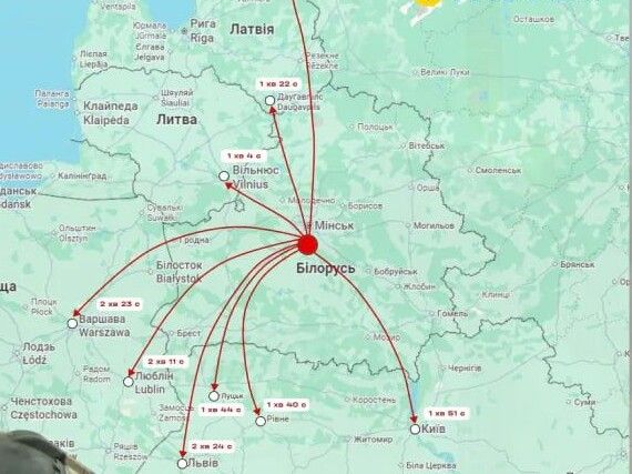 До Рівного вона може долетіти орієнтовно за 1 хвилину 40 секунд, до Луцька — за 1 хвилину 44 секунди, а до Києва — за 1 хвилину 51 секунду, до Львова — 2 хвилини 24 секунди.