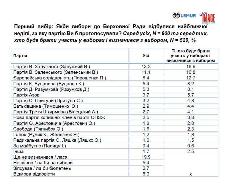 Так, партію ексголовкома, а нині посла у Великій Британії Валерія Залужного готові підтримати 13,2%.