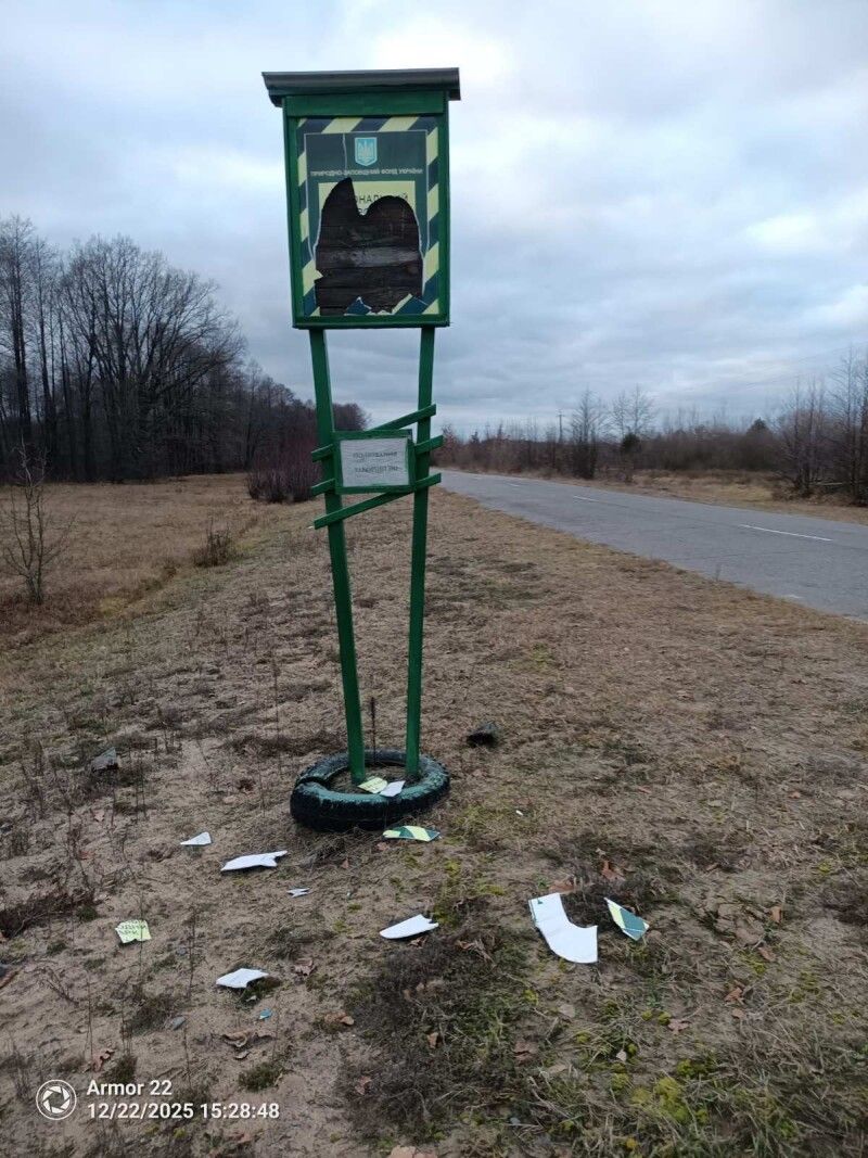 Окрім бесідок, альтанок, кострищ бездушні та байдужі «любителі природи» знищують та пошкоджують охоронні, межові знаки, шлагбауми та інформаційні щити.