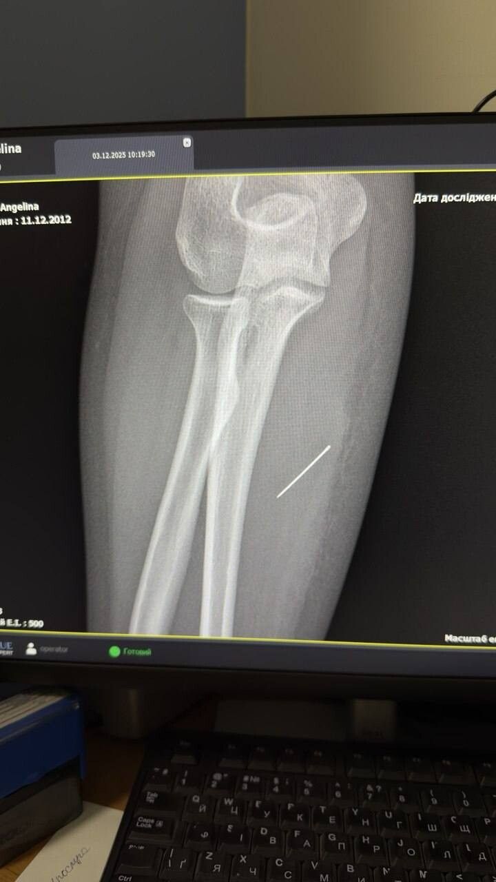 За той тиждень, що Ангеліна проходила з голкою, та просунулася глибше. Вже на рентгені лікарі чітко побачили, що голка зайшла під кутом 45 градусів і застрягла глибоко в товщі м’яза. Якби вона мігрувала ще далі, то могла б пошкодити або судини, або нервові закінчення.