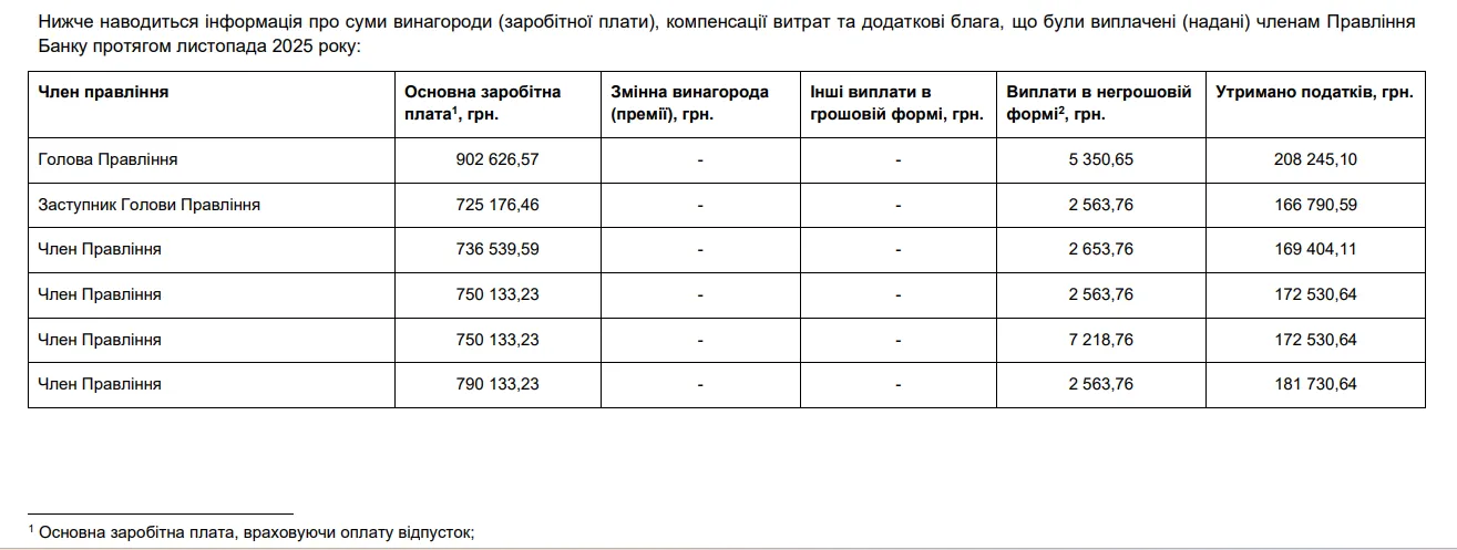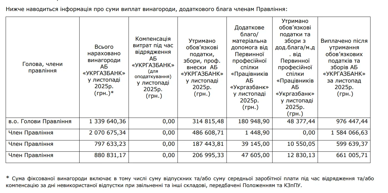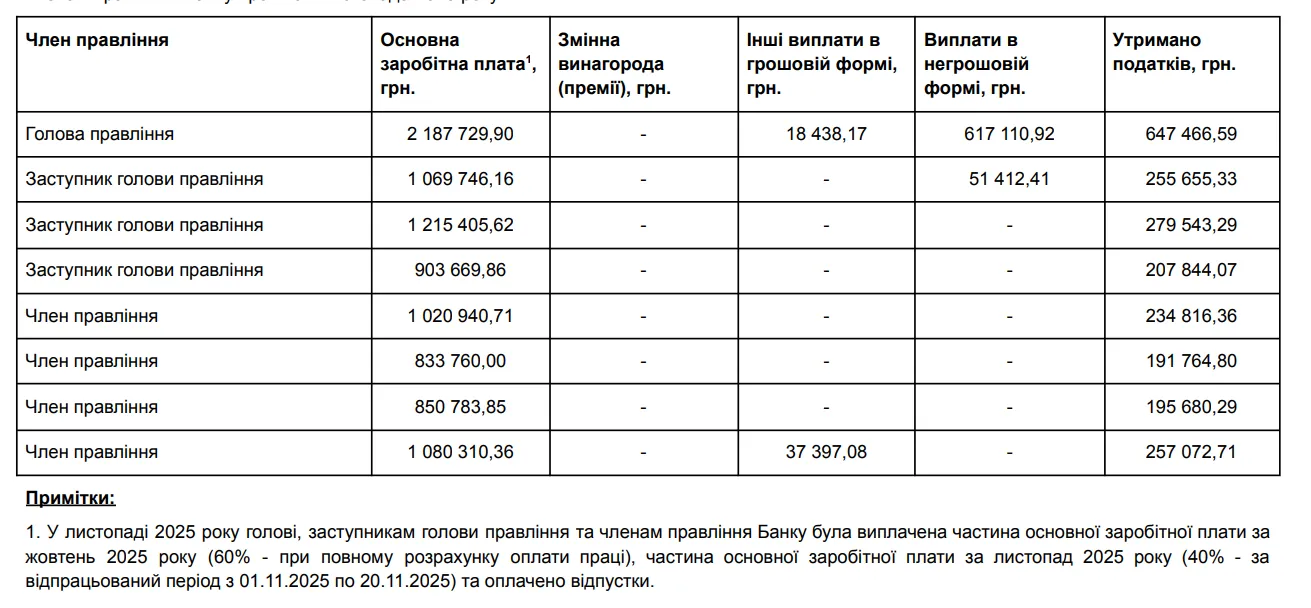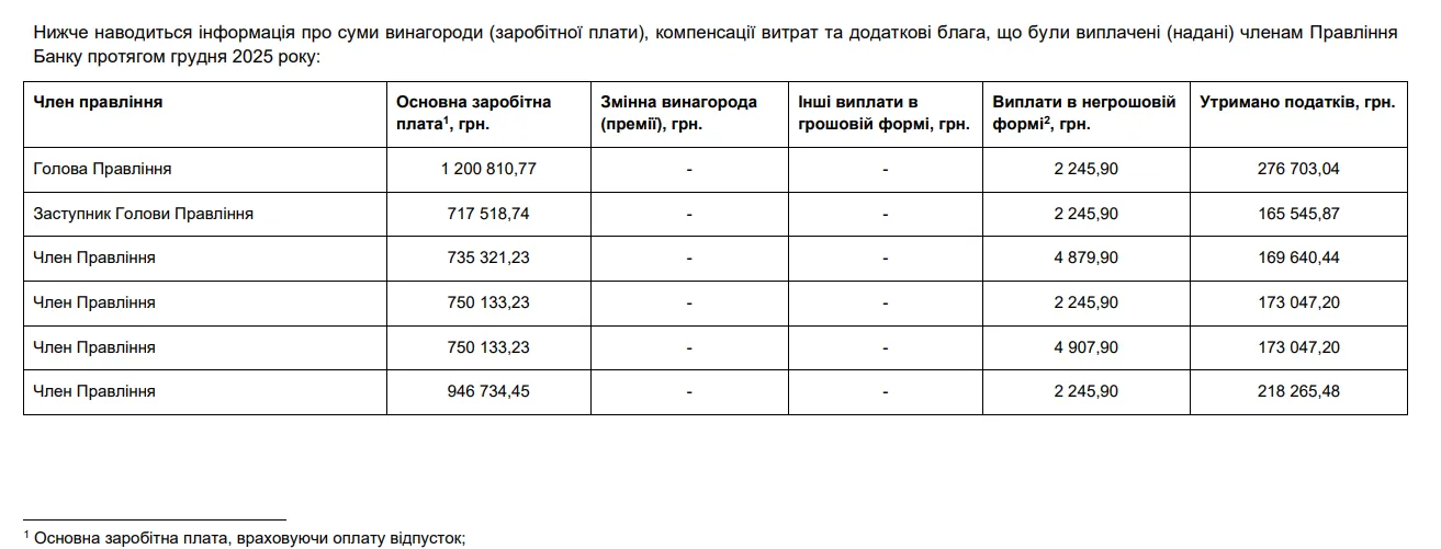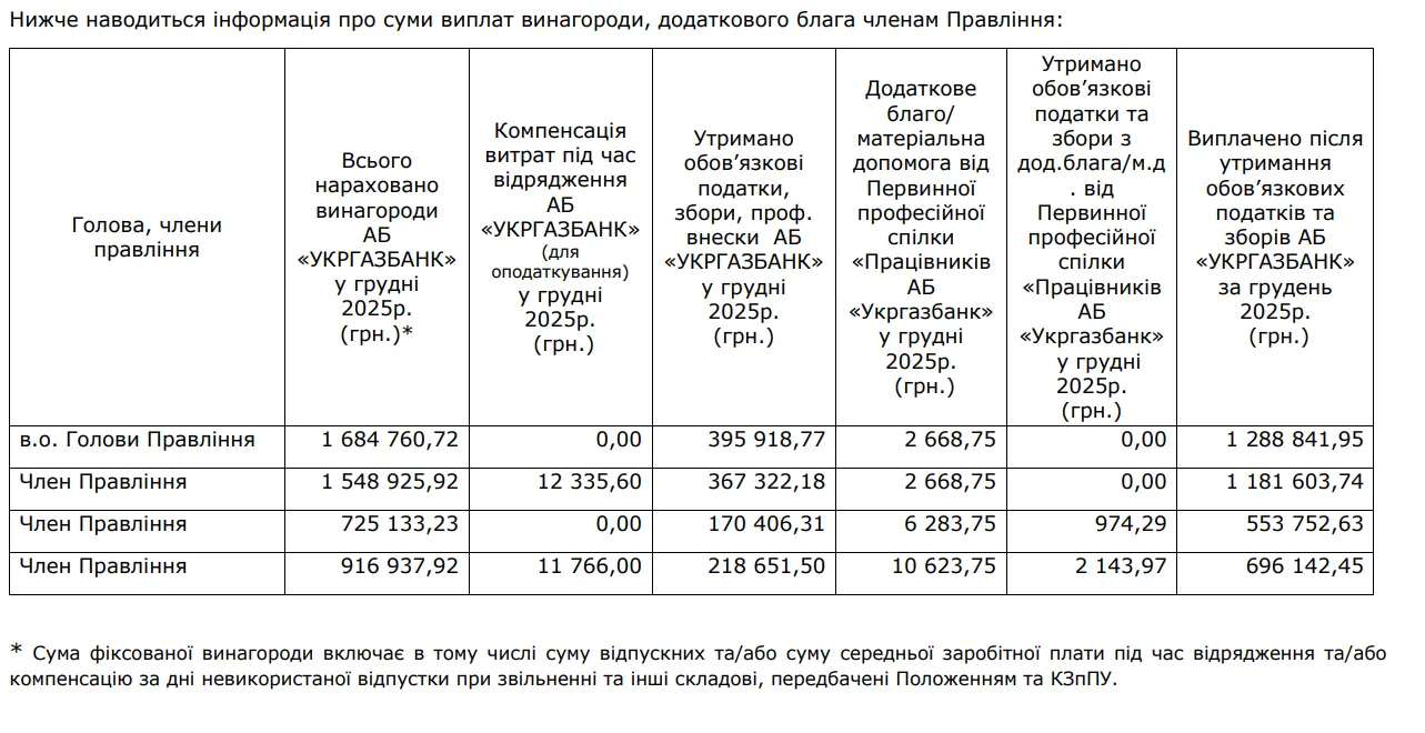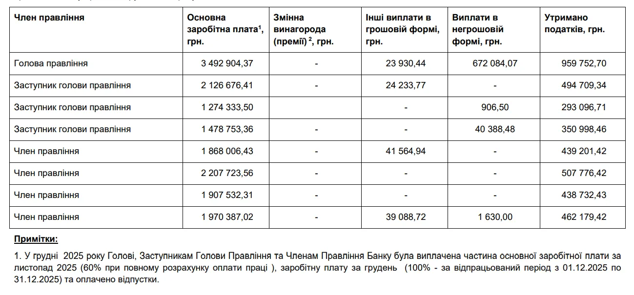 При тому в звіті зазначили, що у грудні 2025 року голові, його заступникам та членам правління виплатили частину основної заробітної плати за листопад 2025 (60% при повному розрахунку оплати праці ), заробітну плату за грудень (100% – за відпрацьований період з 01.12.2025 по 31.12.2025) та оплачено відпустки.