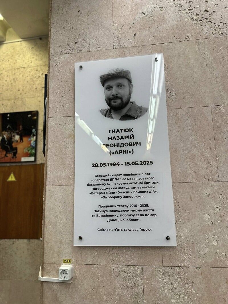 У Волинському обласному академічному драматичному театрі імені Тараса Шевченка відкрили меморіальну дошку на честь загиблого захисника України та працівника театру Назарія Гнатюка. До повномасштабного вторгнення він виконував обов’язки машиніста сцени.
