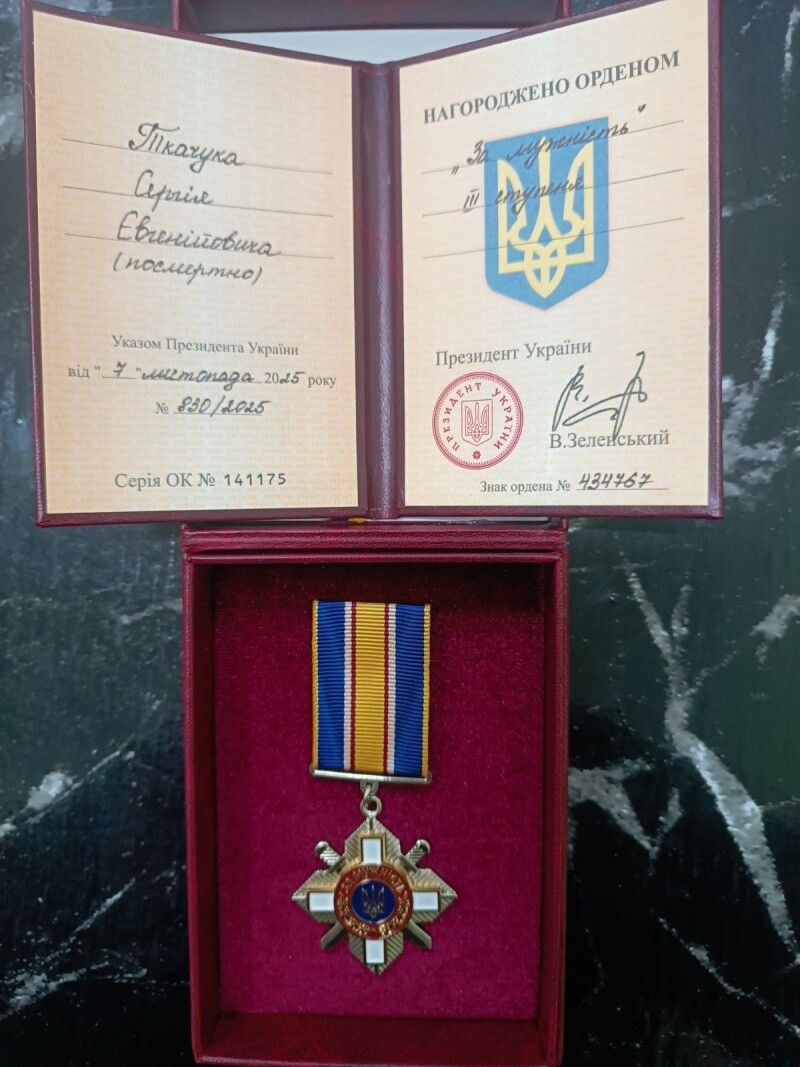 Відповідно до Указу Президента України від 7 листопада 2025 року №830/2025, за особистий внесок у захист державного суверенітету та територіальної цілісності України, самовіддане виконання військового обов’язку та високий професіоналізм орденом «За мужність» ІІІ ступеня (посмертно) нагороджено старшого солдата Ткачука Сергія Євгенійовича.
