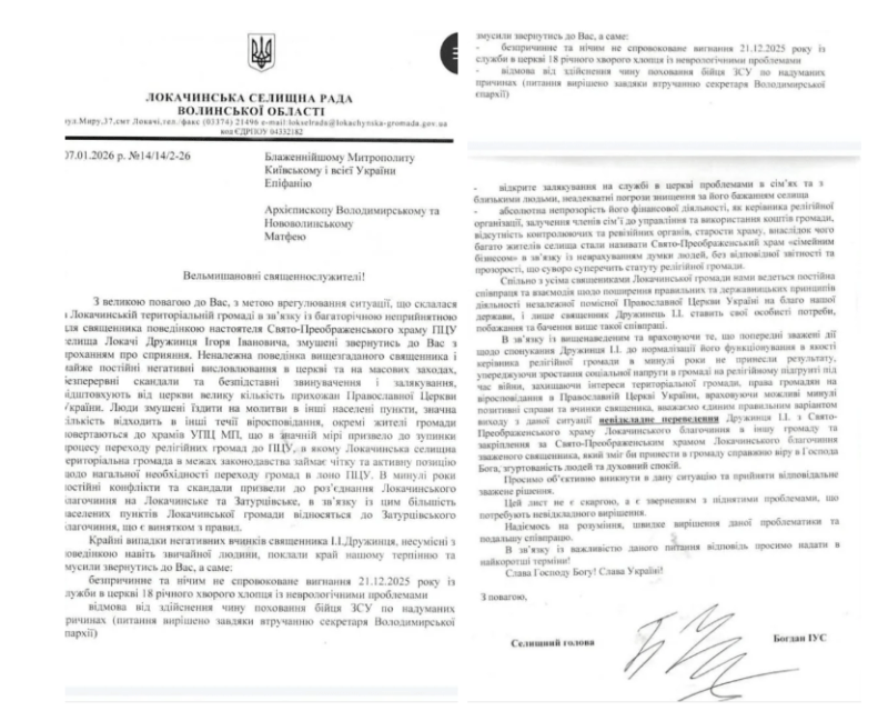 У зверненні селищний голова попросив церковне керівництво розглянути доцільність подальшого служіння отця Ігоря Дружинця саме в Локачинській громаді, фактично запропонувавши його переведення до іншого населеного пункту.