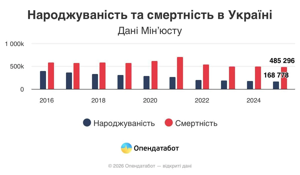 У 2025 році в Україні народилось 168 778 дітей, тоді як смертей зафіксовано 485 296. Це означає, що на одного новонародженого припадає троє померлих.