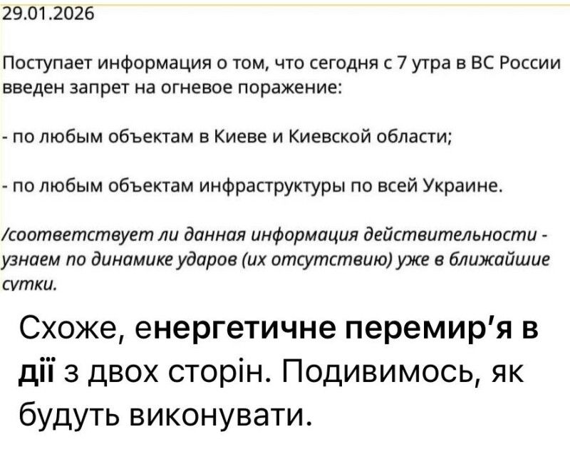 З самого ранку 29 січня російські мілітарі-канали почали поширювати інформацію про нібито введену заборону на вогневе ураження будь-яких об'єктів критичної інфраструктури на території України. Згідно з їхніми даними, наказ набрав чинності о 07:00.