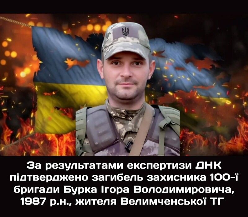 «З глибоким болем і сумом повідомляємо, що за результатами експертизи ДНК підтверджено загибель військовослужбовця 100-ї бригади Бурка Ігоря Володимировича, 27.12.1987 р.н., який з 20 березня 2025 року вважався безвісти зниклим.