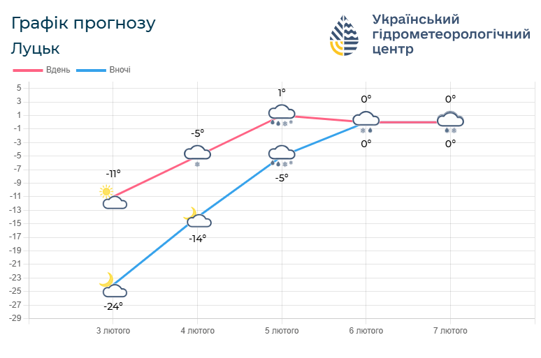 Температура повітря вночі становитиме 22 – 27°С морозу, вдень – 9 –14°С морозу.