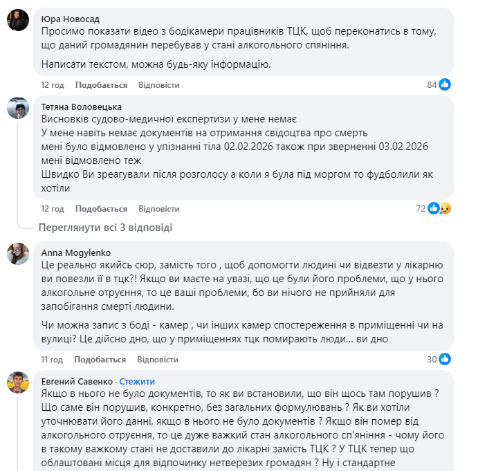 Люди обурені: якщо алкогольне отруєння було настільки важким, що вбило людину за лічені години, то чому вона опинилася в «кімнаті відпочинку», а не на лікарняному ліжку? Питання, як можна проводити мобілізаційні заходи з людиною в неадекватному стані, залишається відкритим