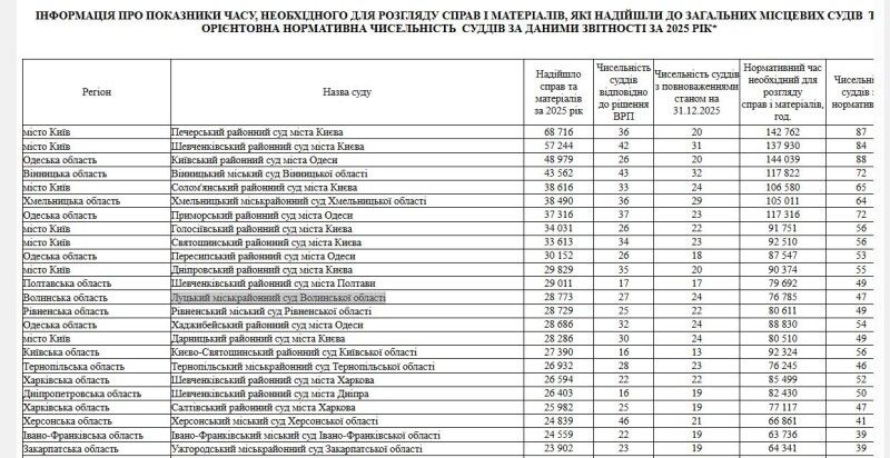 Інформація, що відображена в інтерактивній карті, сформована за даними судової статистики за 2025 рік, де розраховані показники нормативного часу, необхідного для розгляду справ і матеріалів, які надійшли до місцевих та апеляційних судів, та орієнтовна нормативна чисельність суддів місцевих та апеляційних судів.