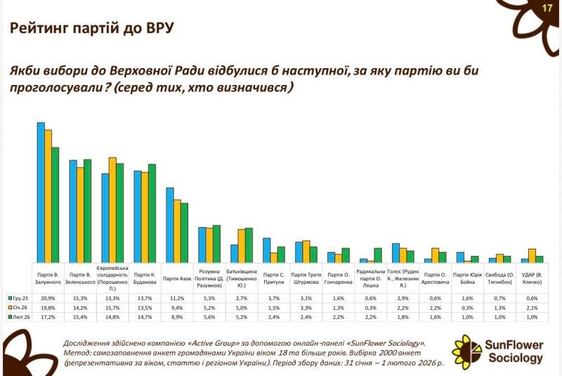 За партію В.Залужного у лютому 2026 року готові проголосувати 17,2% серед тих, хто визначився. За партію В.Зеленського - 15,4%. За «Європейську Солідарність» - 14,8%.