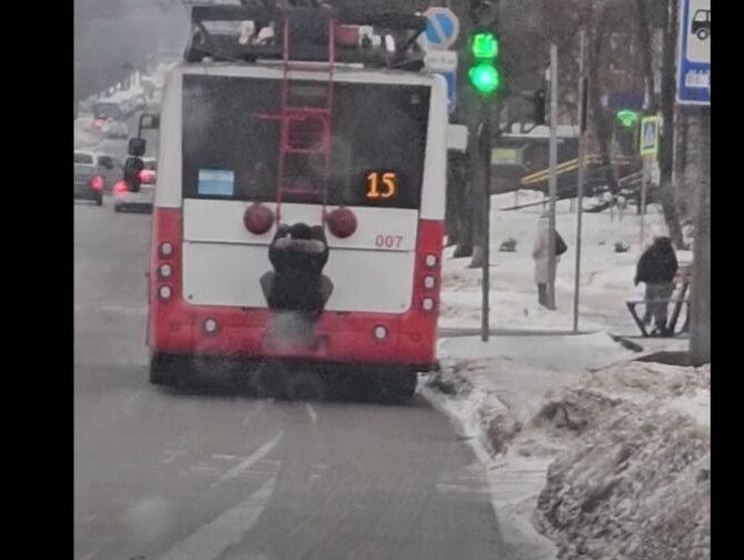 У Луцьку на проспекті Відродження помітили хлопця, який зачепився за тролейбус, щоб проїхатися «зайцем »