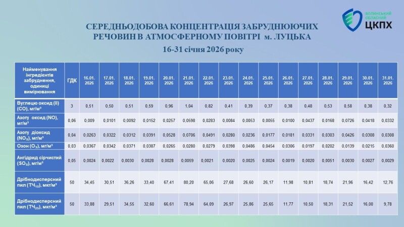 «У січні 2026 року за даними спостережень стану атмосферного повітря на стаціонарному посту міста Луцьк (вул. Винниченка) відношення середньомісячних величин до їх гранично допустимої концентрацій показав перевищення в окремі дні середньодобових гранично допустимих величин вмісту озону, азоту діоксиду та фракцій дрібнодисперсного пилу. Це можливе внаслідок роботи котелень на твердому паливі у холодний період сезону.