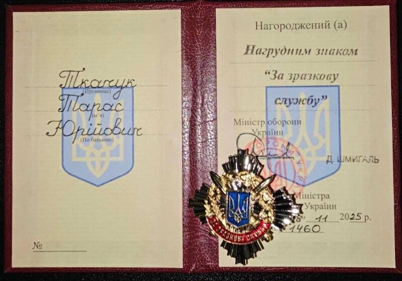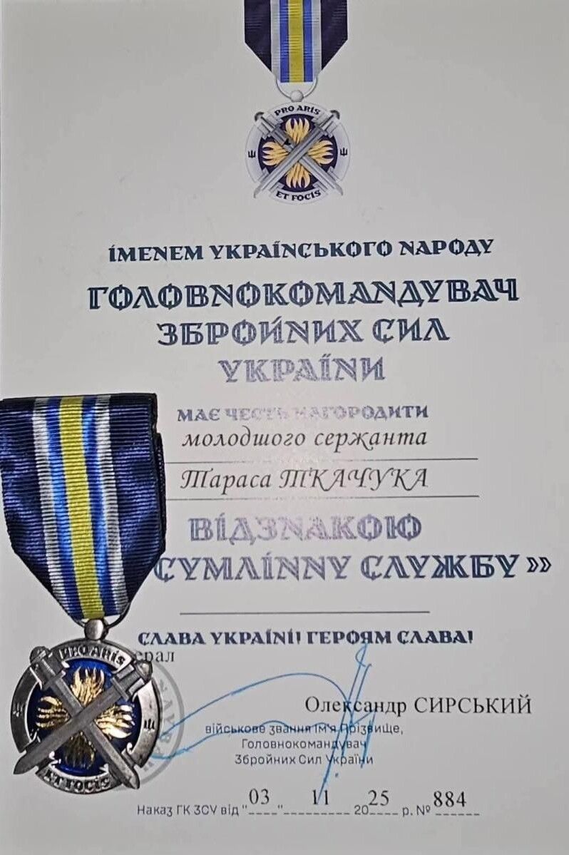 Також Тарас Ткачук нагороджений нагрудним знаком та посвідченням «За зразкову службу» від Міністра оборони України. Відзнака вручається військовослужбовцям ЗСУ за зразкове виконання обов’язків, високий рівень професійної майстерності та самовідданість.