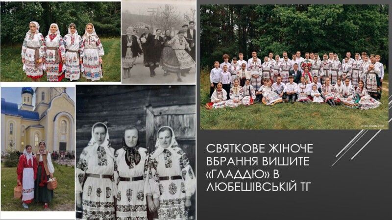 - Святкове жіноче вбрання, вишите «гладдю», у Любешівській територіальній громаді – традиційний одяг, що вирізняється локальною орнаментальною та технічною самобутністю;