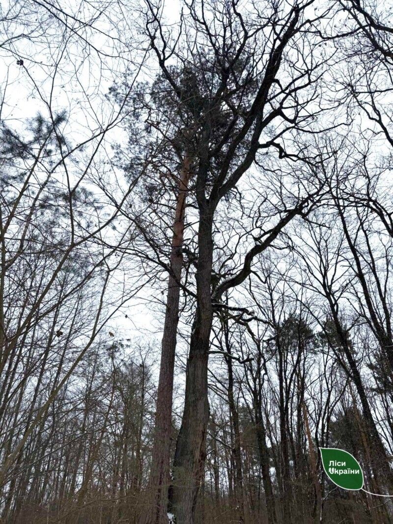 Сосна і дуб ростуть настільки близько, що здається — їхні стовбури торкаються. Зазвичай ці породи конкурують: сосна потребує світла і швидко тягнеться вгору, дуб — формує потужну кореневу систему й розвивається повільніше. Але тут вони не витіснили одне одного.
