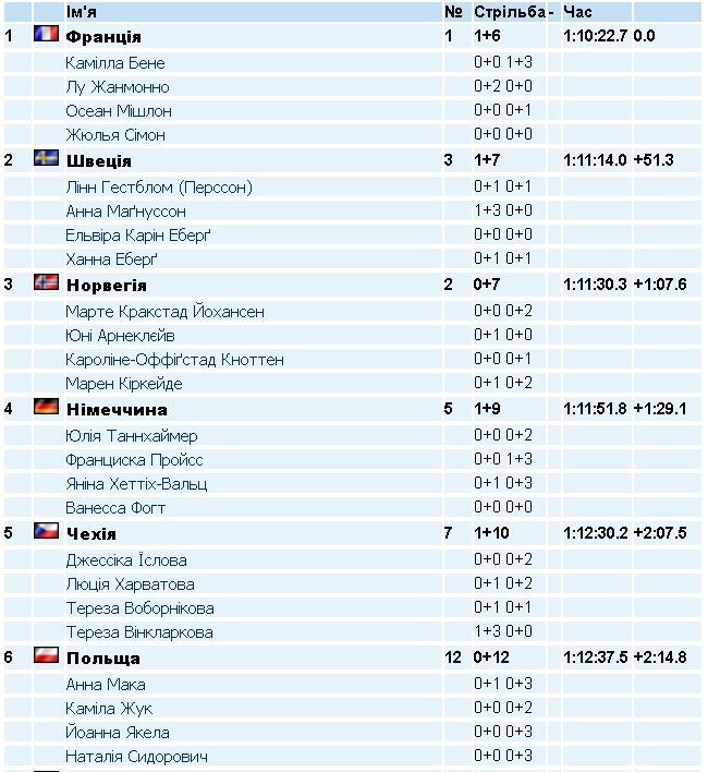А «золото» просто з тотальною перевагою здобули француженки. Навіть не дивлячись на те, що Камілла Бене почала гонку з заїзду на штрафне коло, Лу Жанмонно і Осеан Мішлон на двох наступних етапах створили для фінішерки Жюлії Сімон таку перевагу, що свій етап вона могла провести в прогулянковому режимі. Сімон, правда, і стріляла, і бігла абсолютно ідеально і на фініші виграла у шведок, які стали другими, 51 секунду».