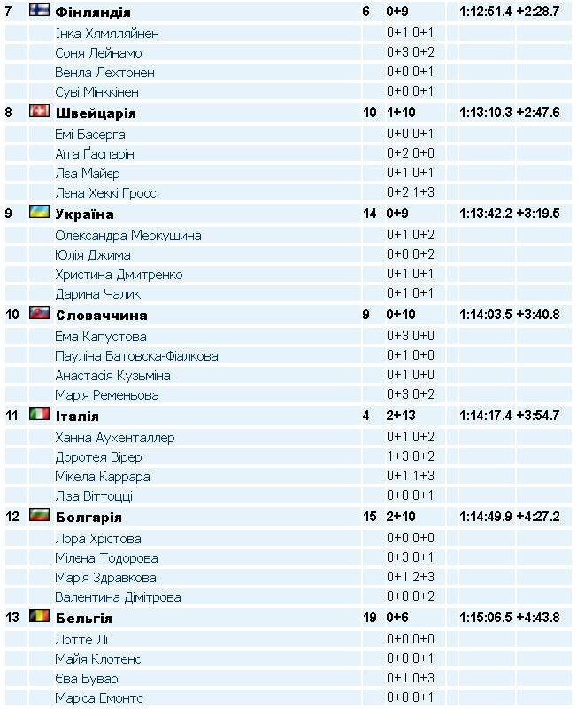 Інша річ, що два заключних етапи привели нас до тями і змусили відректися від ностальгійних паралелей. Христина Дмитренко виступила в Антерсельві недобре і причина приховується в її поганій фізичній готовності. Використавши лише два додаткових набої і закривши всі мішені, Христина завершила свій відрізок естафети десятою з відставанням від лідера в 2 хвилини і 6 секунд. Так само однією з найгірших за швидкістю була й наша представниця на заключному етапі – Дарина Чалик. Утримати команду в топ-10, на дев’ятому місці, Дарина змогла лише завдяки влучній стрільбі (два додаткових набої). На фініші вона програла чемпіонкам 3.19,5.