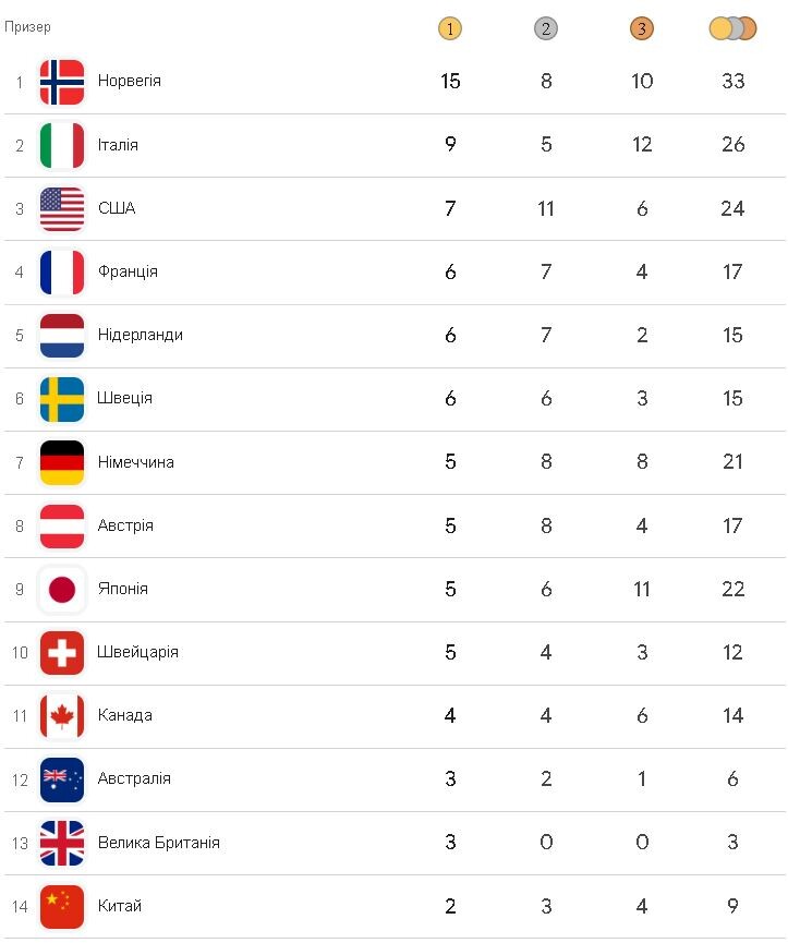 Олімпіада-2026. Медальний залік на ранок 19 лютого:
