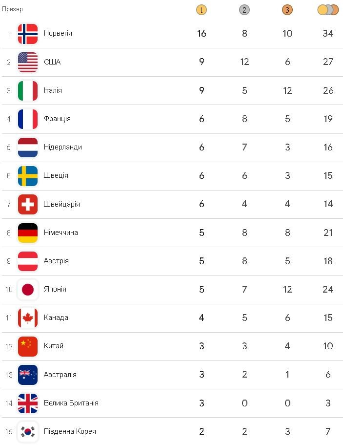 Олімпіада-2026. Медальний залік на ранок 20 лютого: