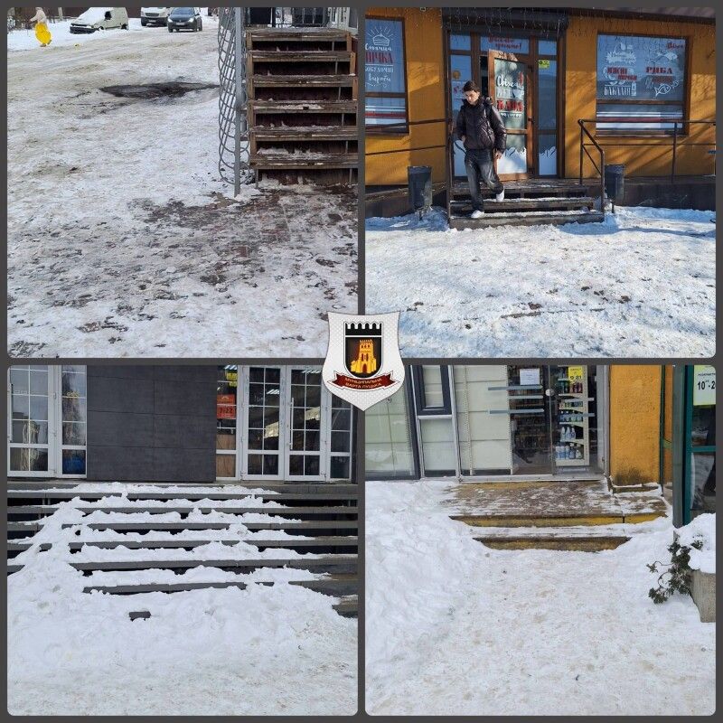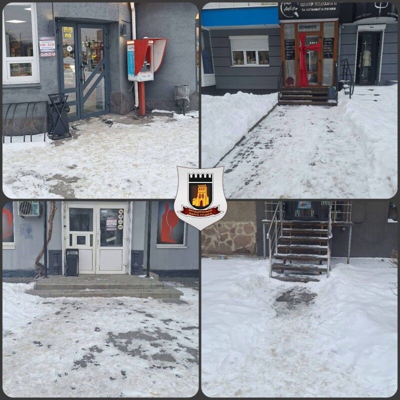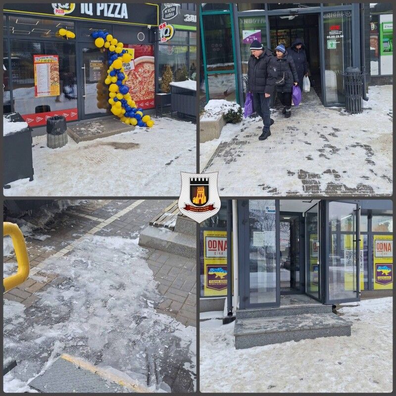 Під час перевірки було виявлено численні факти неналежного утримання прилеглих територій біля об’єктів комерційного призначення. Тротуари та підходи до приміщень залишалися нерозчищеними від снігу та льоду, що створювало небезпеку для відвідувачів.
