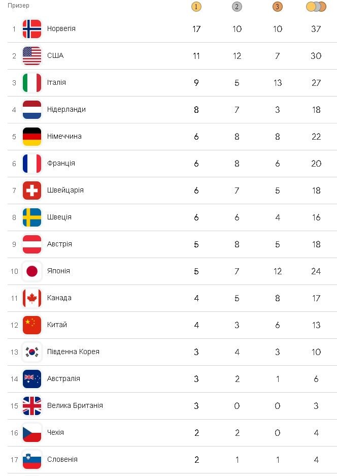 Медальний залік Олімпіади-2026 на 13:30 21 лютого: