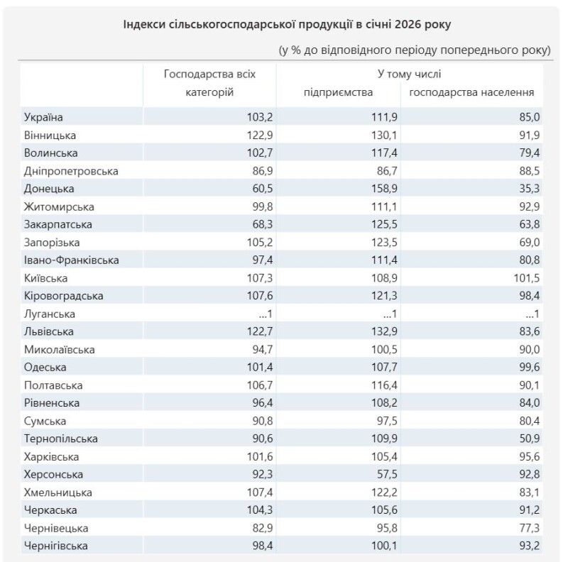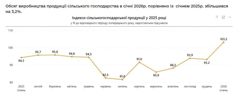 Обсяг виробництва сільськогосподарської продукції в Україні в січні 2026 року зріс на 3,2% проти аналогічного періоду торік