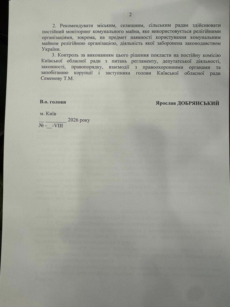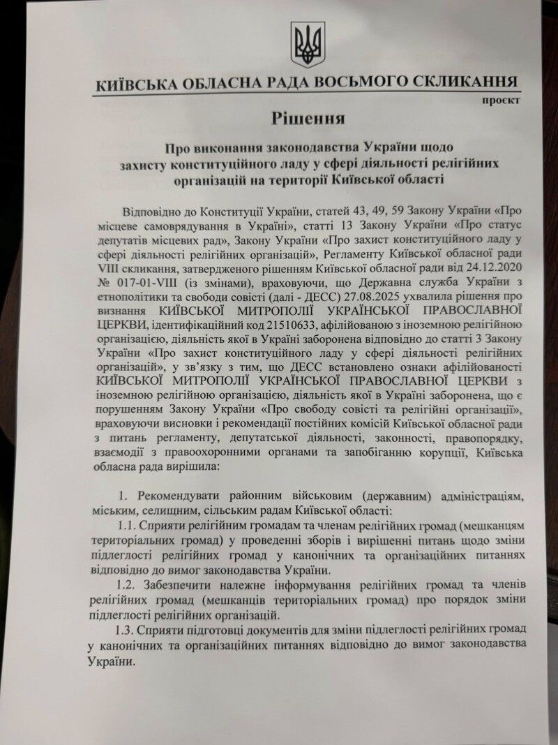 Київська обласна рада ухвалила важливе рішення — «Про виконання законодавства України щодо захисту конституційного ладу у сфері діяльності релігійних організацій на території Київської області»