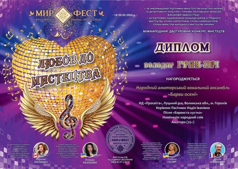 З приємністю ділимося новиною про здобутки невтомних учасниць народного аматорського вокального ансамблю «Барви осені» під керівництвом Надії Пасічнюк, які стали володарами ГРАН-ПРІу міжнародному двотуровому конкурсі «Любов до мистецтва».