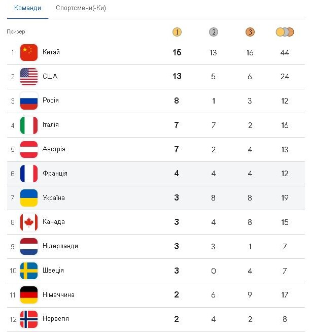 Найближчого переслідувача США Китай обійшов на два «золота». Третє місце – в країни-терористки росії, яка була представлена лише 6-ма спортсменами, але виборола 12 медалей, 8 з яких – золоті.