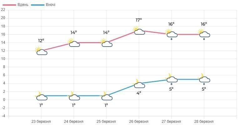 По області – мінлива хмарність. Без опадів. Вітер північно-західний, 3-8 м/с. Температура вночі від 2° морозу до 3° тепла, вдень 11-16° тепла.