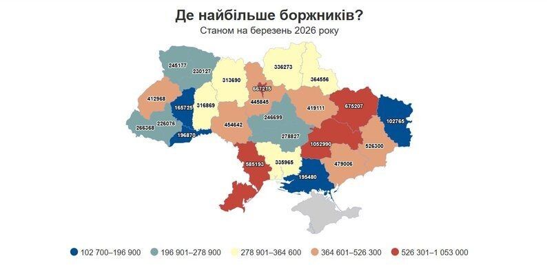 Найбільше боргів припадає на Дніпропетровщину, де налічується 1052990 проваджень, або майже 11% від усіх боргів. Далі Харківська область — 675207 проваджень (7%), Київ — 667215 (7%), Одеська область — 585193 (6%) та Донецька область — 526300 (6%).